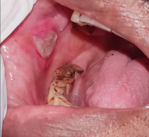 Figure 1. Clinical image showing a solitary, non-tender hemorrhagic bulla (3 × 2 cm) on the right buccal mucosa adjacent to the right mandibular second premolar.